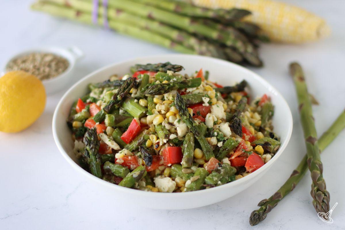 Celebrate the season with this fresh and vibrant Roasted Corn and Asparagus Salad. Pair sweet, charred corn with tender roasted asparagus for a delicious balance of flavors. Toss everything in a zesty vinaigrette to bring the ingredients to life. Finish with a sprinkle of fresh herbs to add a burst of color and aroma. Serve warm or chilled to complement any picnic, barbecue, or weeknight dinner with your choice of meat and a batch of my Blueberry Corn Muffins. Use the same dressing to make my Lemon Asparagus Orzo recipe.