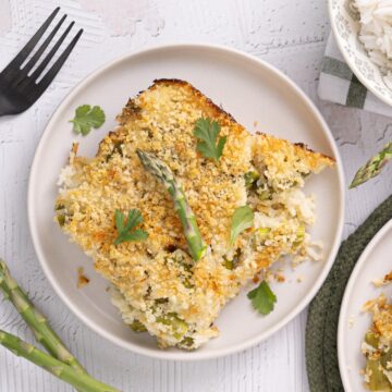 6. Sprinkle the panko topping into the baking dish evenly on top of the asparagus-rice mixture. Bake for 20–25 minutes, until hot throughout and golden on top. Let the casserole sit for about 5 minutes before serving so the sauce sets slightly.