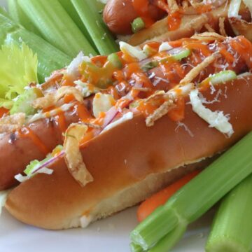Make these hot dog on my Pretzel Hot Dog Buns and then try my French Onion Hot Dog made on croissants! If you are looking for more buffalo sauce recipes, try either my Buffalo Chicken Stuffed Shells, Buffalo Chicken Salad or my Buffalo Turkey Meatball Sub!