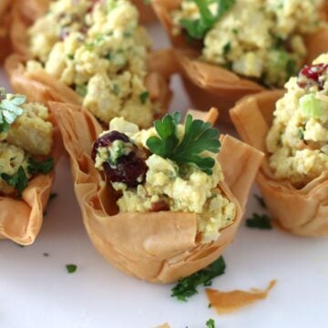 Store any remaining Curry Chicken Salad Phyllo Cups in an airtight container. Place in the refrigerator for 24 hours, keeping in mind that the phyllo cups might soften up as the filling sits in them. Make the Curry Chicken Salad in advance and store by itself for a couple days and use in sandwiches, or on crostini.