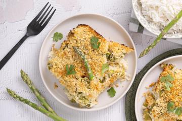 6. Sprinkle the panko topping into the baking dish evenly on top of the asparagus-rice mixture. Bake for 20–25 minutes, until hot throughout and golden on top. Let the casserole sit for about 5 minutes before serving so the sauce sets slightly.