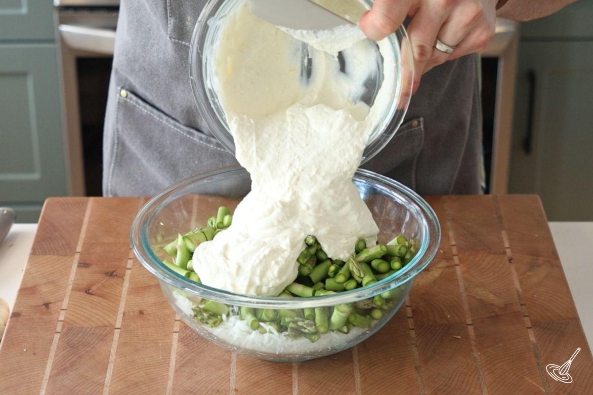 - Combine in a large bowl, the cooked rice, asparagus pieces, and the mascarpone sauce. Stir until everything is well coated by the sauce.