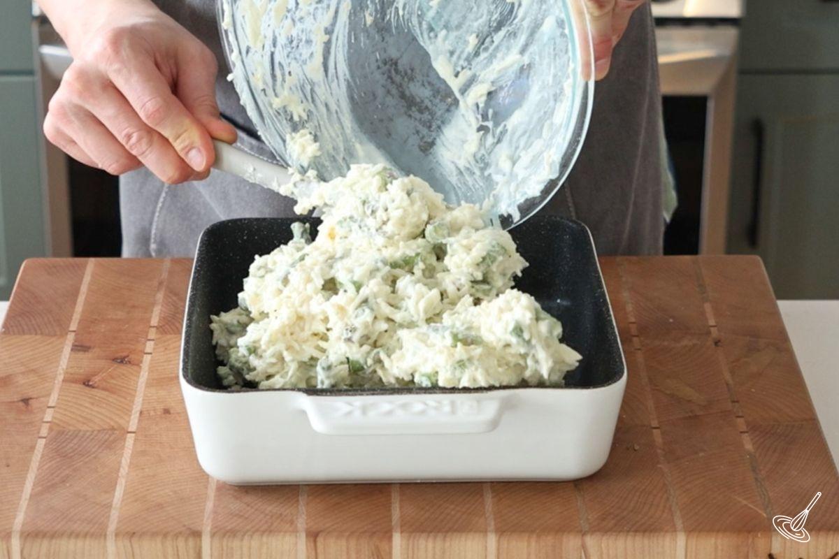 - Transfer the asparagus rice mixture to the greased 9"x9" baking dish. Use a rubber spatula to evenly spread out the mixture.