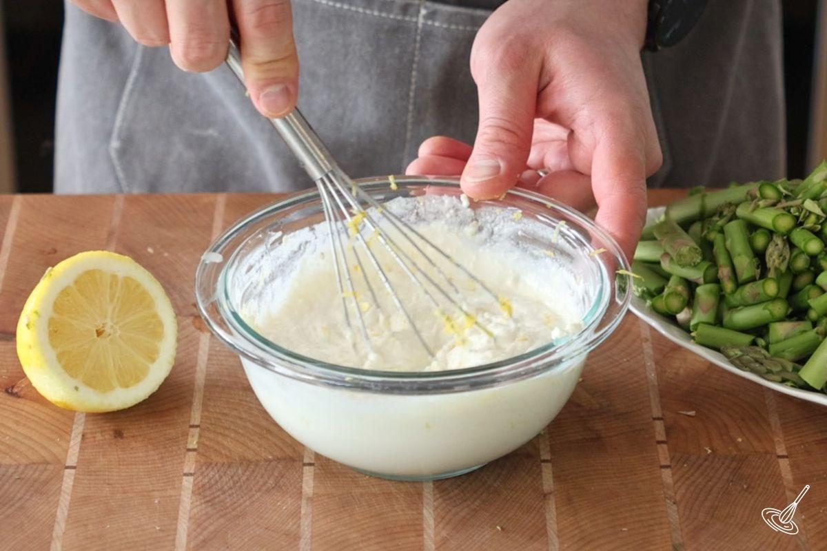 - Whisk together mascarpone, milk, lemon zest, lemon juice, Dijon mustard, parmesan, salt, and pepper until smooth.