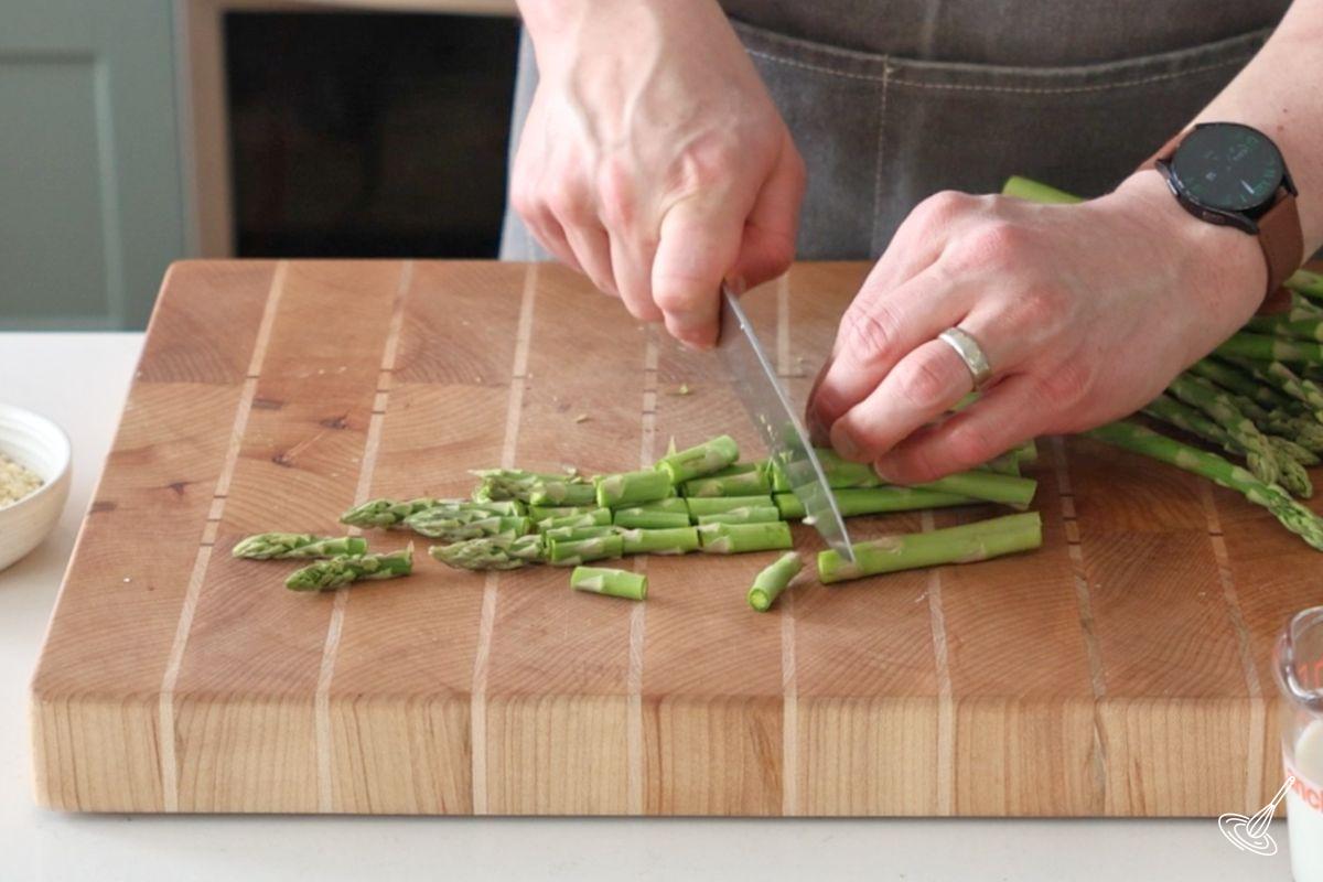 - Prepare the asparagus by removing and discarding the tougher, woody, light colored ends. Cut the remainder in ½ inch pieces. Set aside.