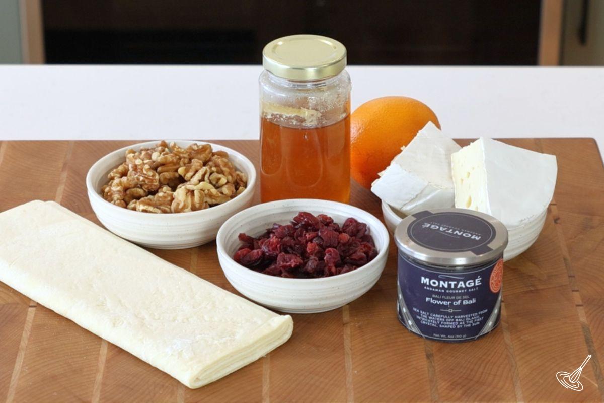 - Place enough brie in each tart to cover the bottom, then sprinkle the nut and cranberry mixture on top. Drizzle ½ teaspoon of liquid honey over each tart. Sprinkle with orange zest and flaky salt.¼ cup Liquid Honey, 2 teaspoon Orange Zest, 1 teaspoon Flaky Sea Salt