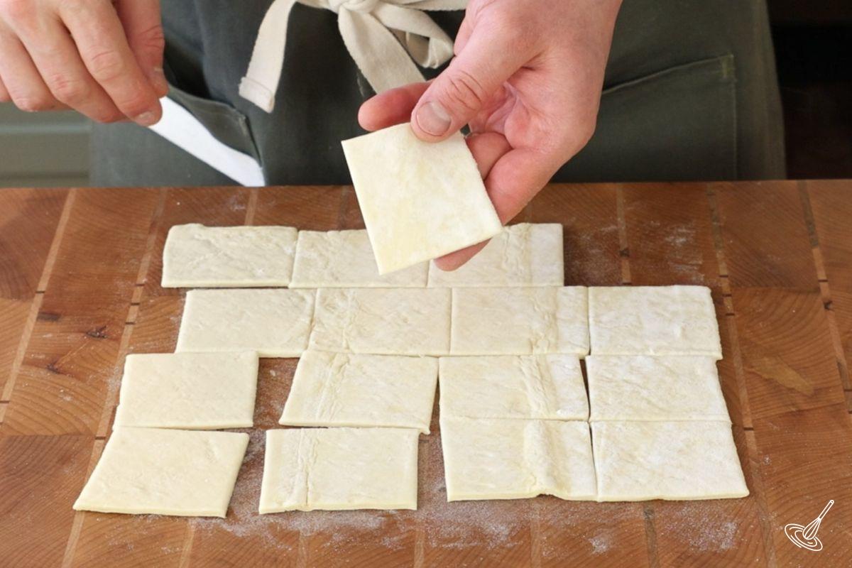- Cut the 10"x10" of puff pastry into small squares measuring 2.5" x 2.5". Achieve this by cutting the large square in half lengthwise and crosswise, then each square in four smaller squares.