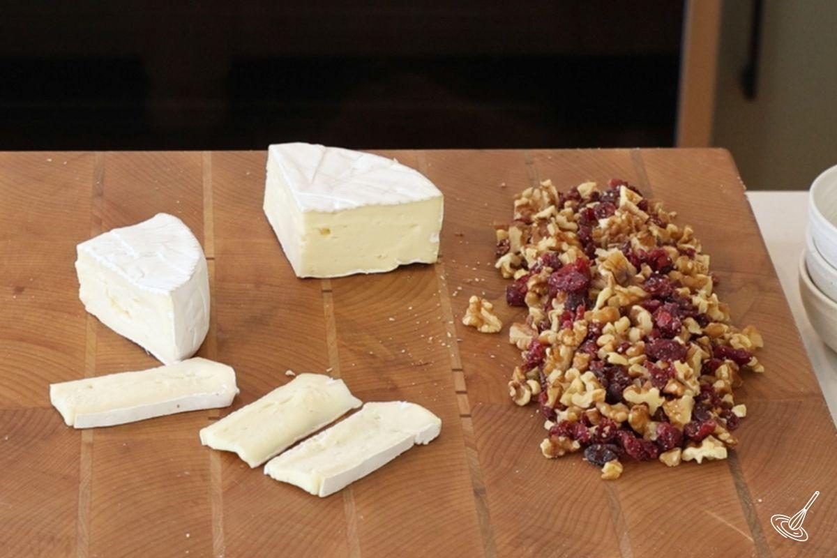 - Prepare the walnuts and dry cranberries by chopping them into small pieces and then combining them. Slice the brie into ¼ inch slices.