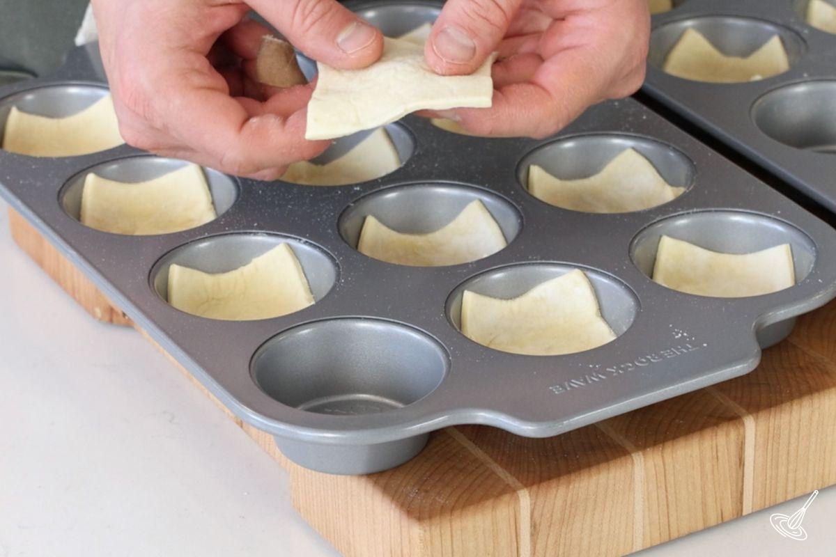 - Place a small square of pastry in each cavity of the muffin mold. Use two 12-cavity muffin mold or bake 8 tarts at a time. Press the pastry in the bottom of the molds, making sure they are centered.