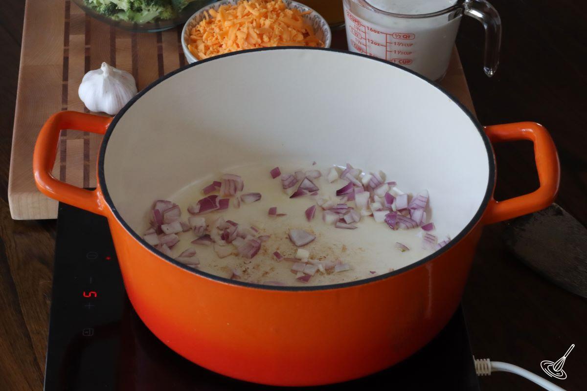 - Drizzle olive oil in the pot and add in the diced red onion. Cook the onions until translucent and then add in the minced garlic. Cook for another 2 minutes.