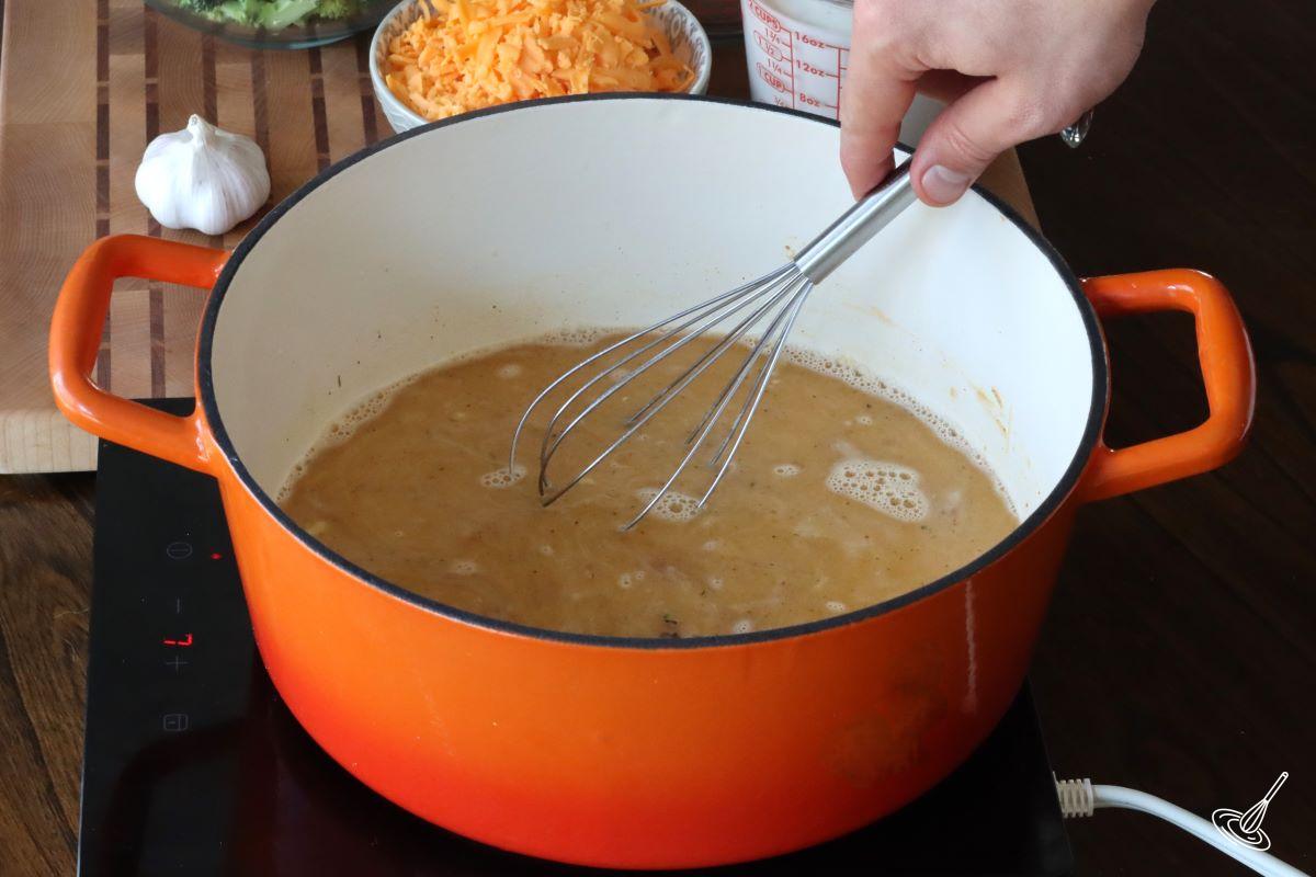4. Stir in the milk and cream into the thickened broth and bring back to a simmer. Add the broccoli florets and chopped bell pepper.