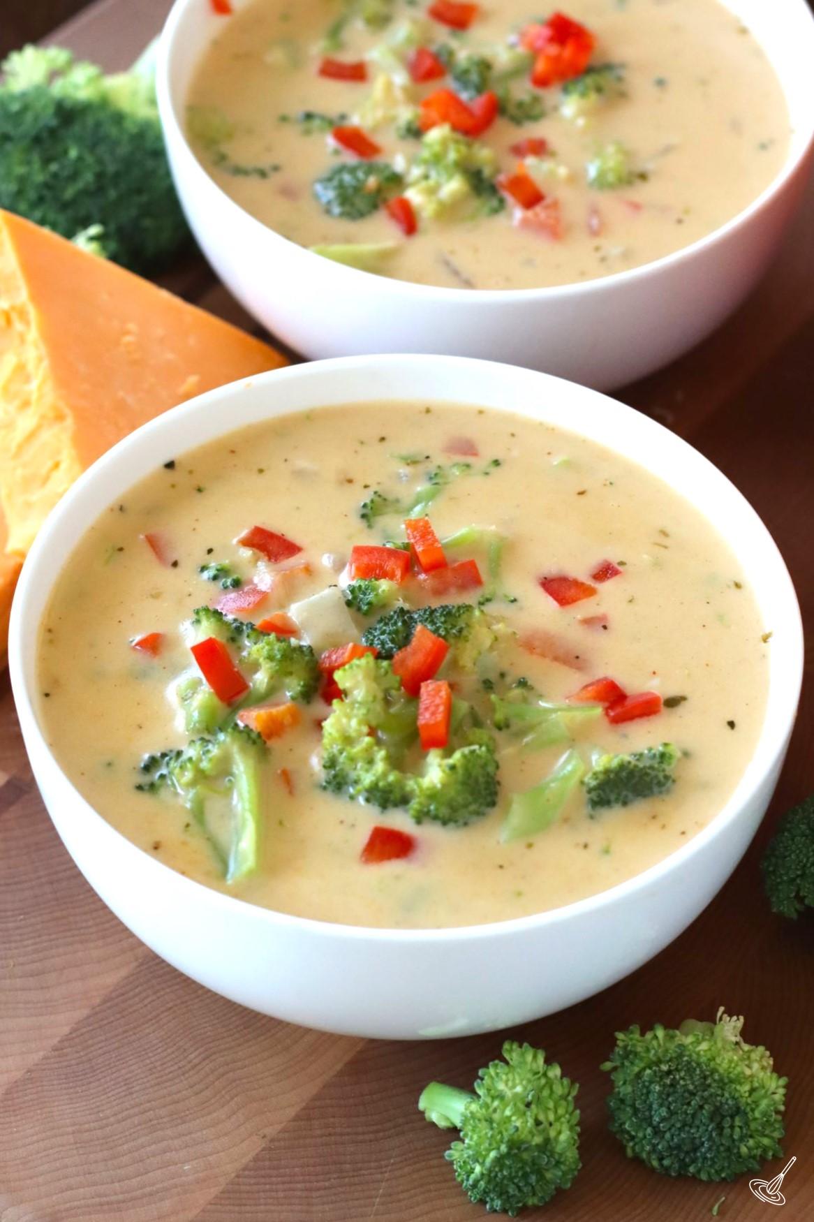 - Stir in the milk and cream into the thickened broth and bring back to a simmer. Add the broccoli florets and chopped bell pepper.