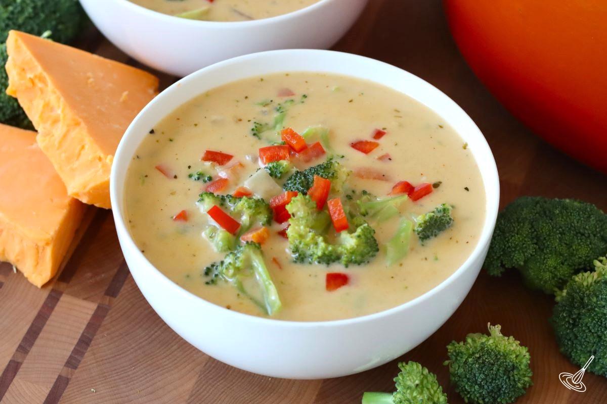 - Take the soup off the heat. Add to it ½ cup of the grated sharp cheddar at a time and stir until incorporated. Serve right away.