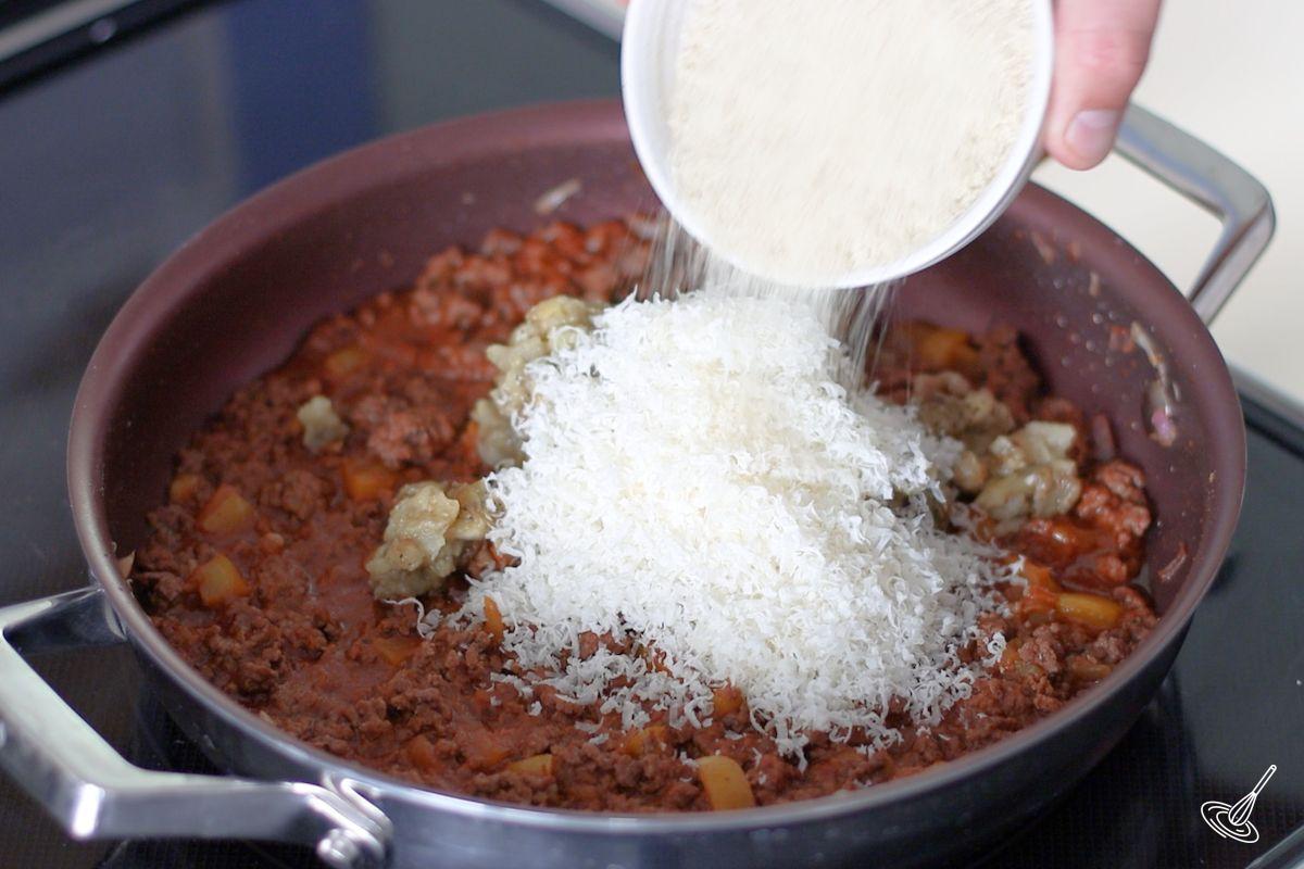 7. Add to the meat sauce, the eggplant, bread crumbs, and grated parmesan cheese. Stir until the panko crumbs absorbs the sauce, becoming thicker.