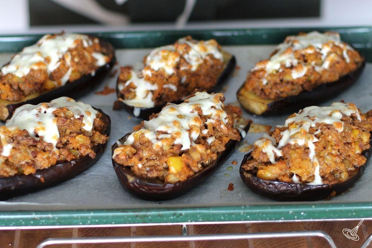 8. Divide the meat filling between the six eggplant shells. Sprinkle the mozzarella over each filled eggplant.