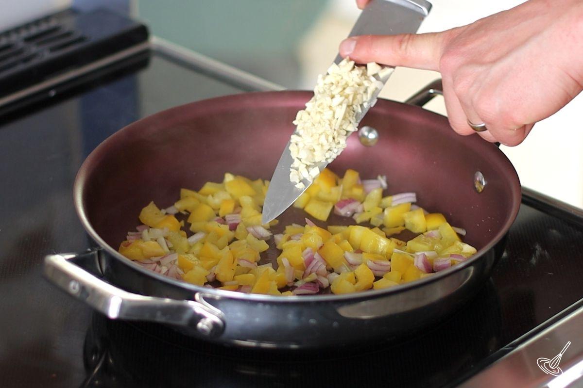 - Start cooking the filling while the eggplants are roasting. Heat a large frying pan on medium heat. Add the bell pepper, red onion, garlic, and optional chili flakes.