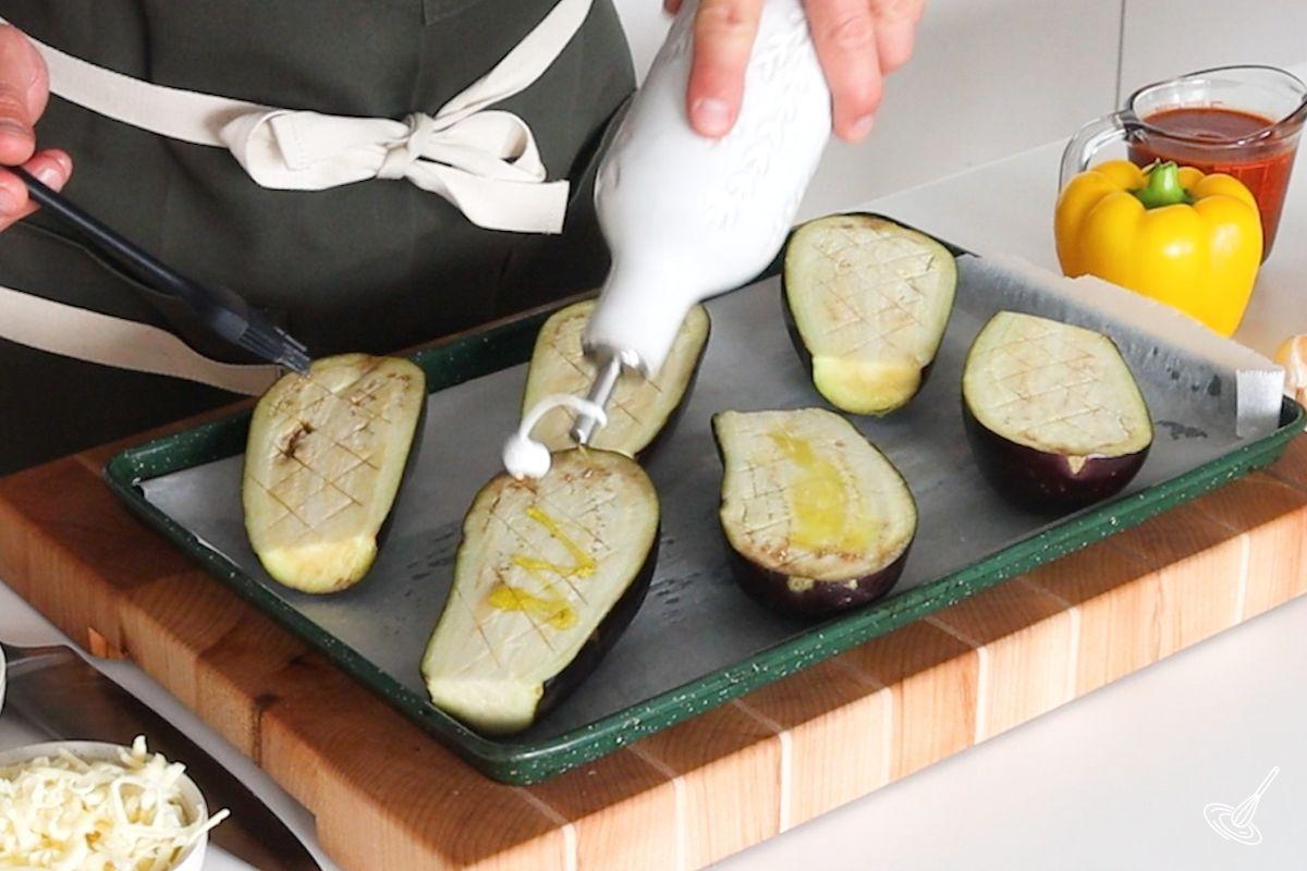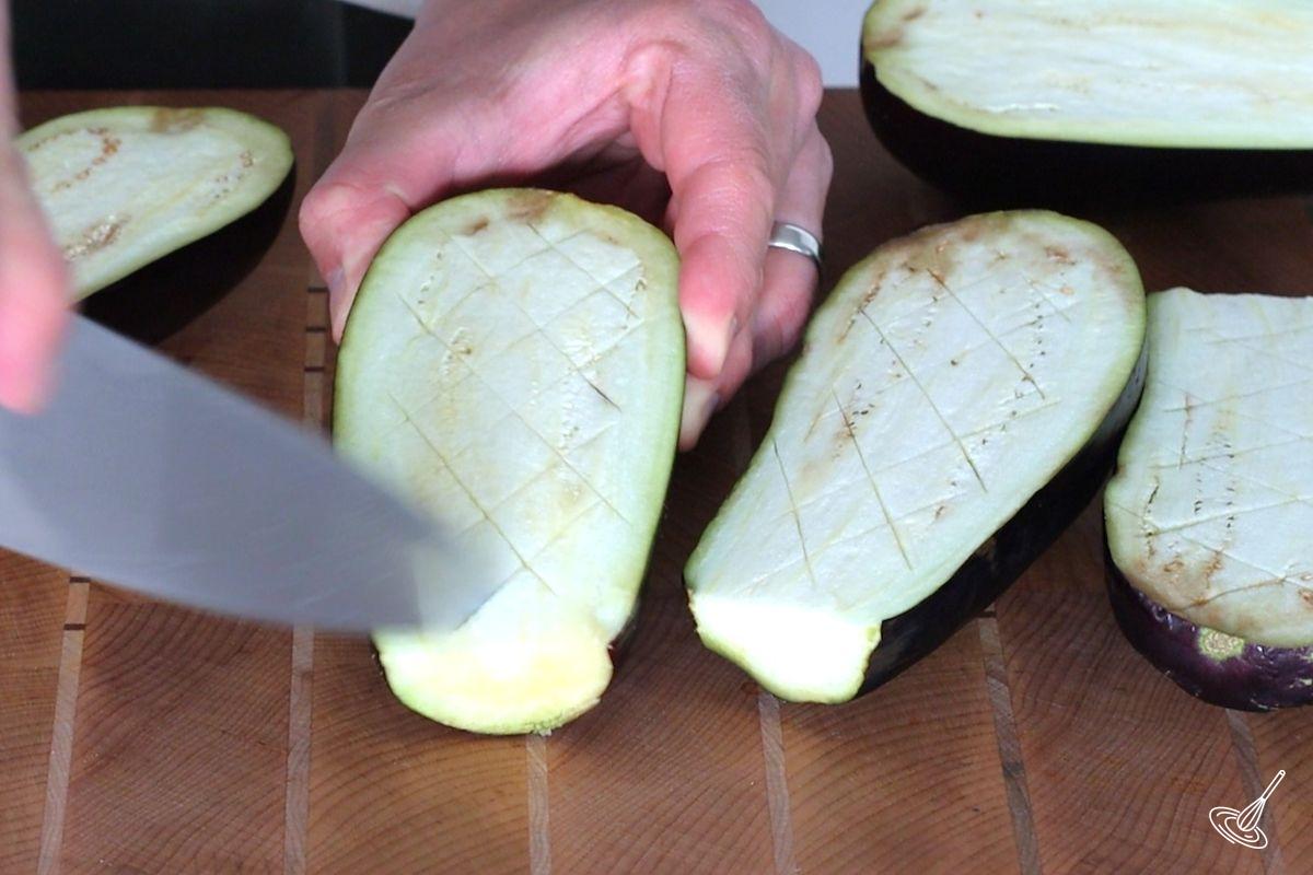 - Cut off the leafy tip from the eggplants. Slice each eggplant in half lengthwise. Cut deep scores in the flesh of each halves, in a 1-inch crisscross pattern.