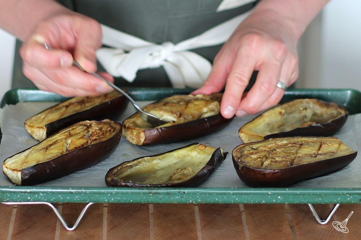 - Carefully remove the flesh from inside the roasted eggplants. Make sure to keep the skin as intact as possible so it can hold the filling. Chop up the removed flesh in fine pieces.