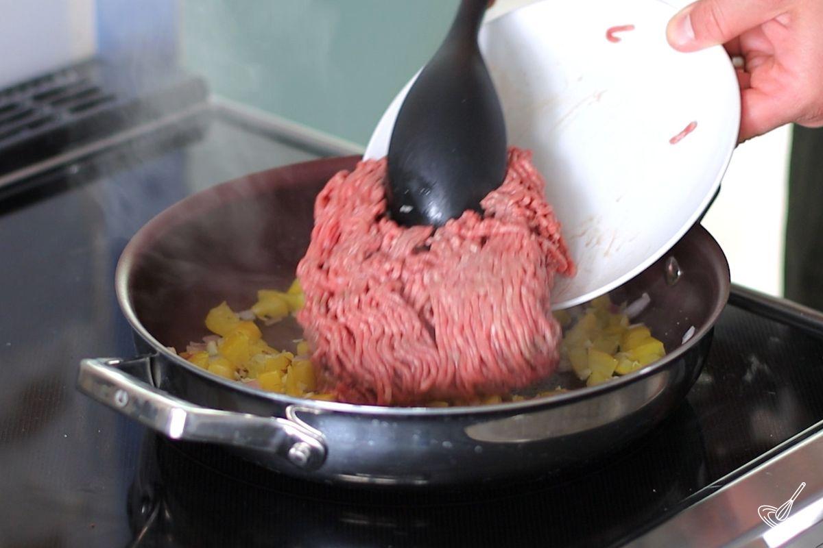 - Add the ground beef to the pan with the veggies. Break it down, stirring it into the vegetables, until fully cooked.