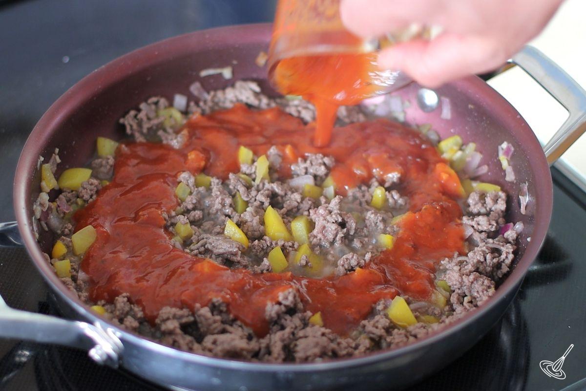 5. Add the tomato sauce to the pan, stir it in, and simmer for 5 minutes.