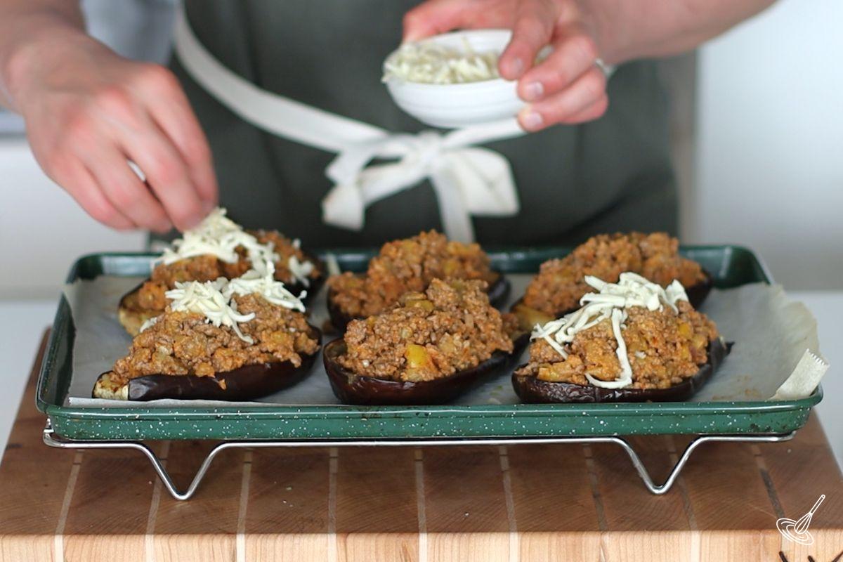 8. Divide the meat filling between the six eggplant shells. Sprinkle the mozzarella over each filled eggplant.