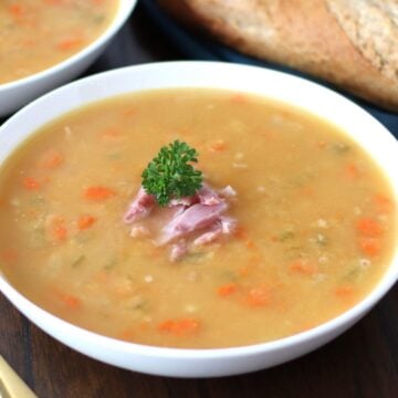 You can find many variations of Split Pea Soup out there. Some with bacon, some with ham hocks, some with no meat at all. As far as I can remember, my family has always used a ham bone to make our traditional Canadian Split Pea Soup. Ingredients for this soup are very simple, but the ham bone provides a ton of flavors!