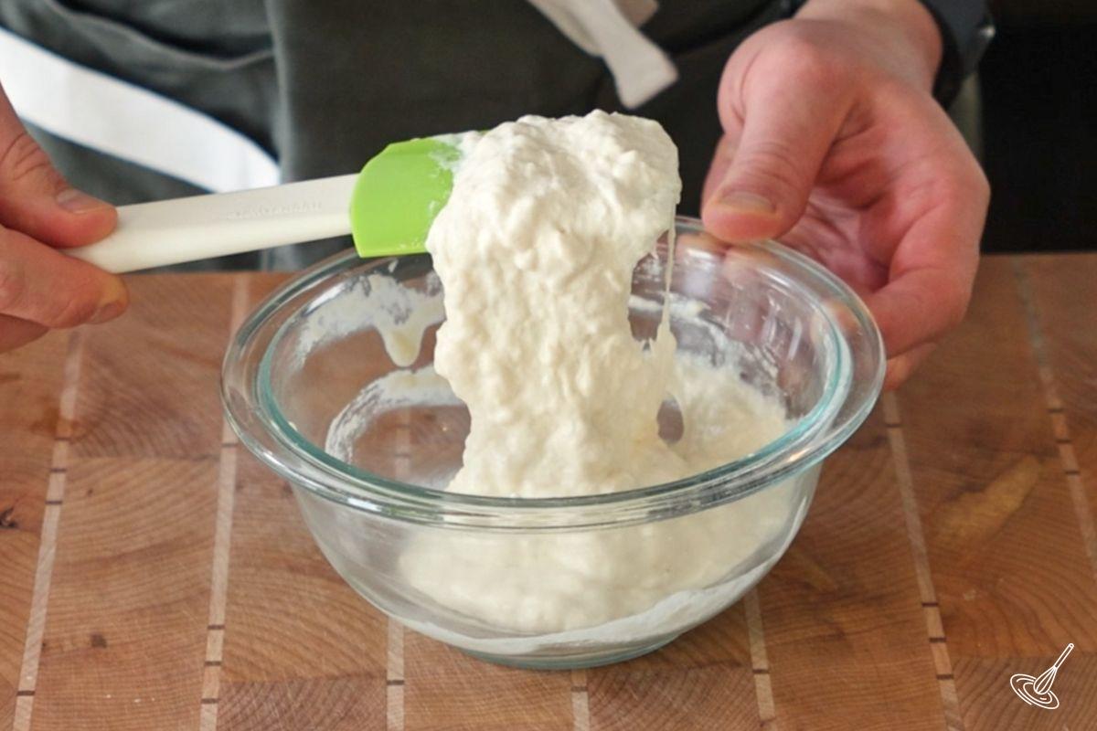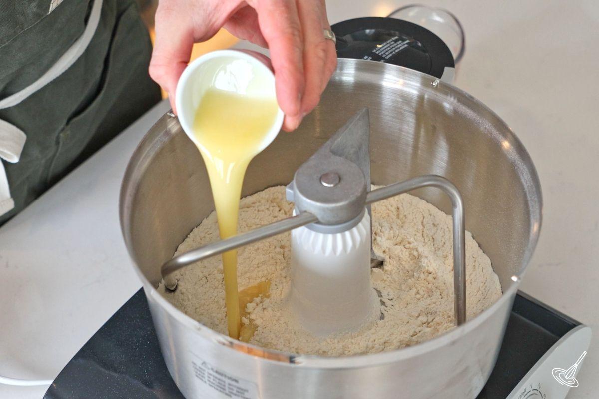 • Pour into the dry ingredients; the melted butter, eggs, and proofed yeast mixture. Knead for 5 minutes of until the dough comes together, until smooth. Fold in shredded cheddar and chives during the final 30 seconds of kneading.