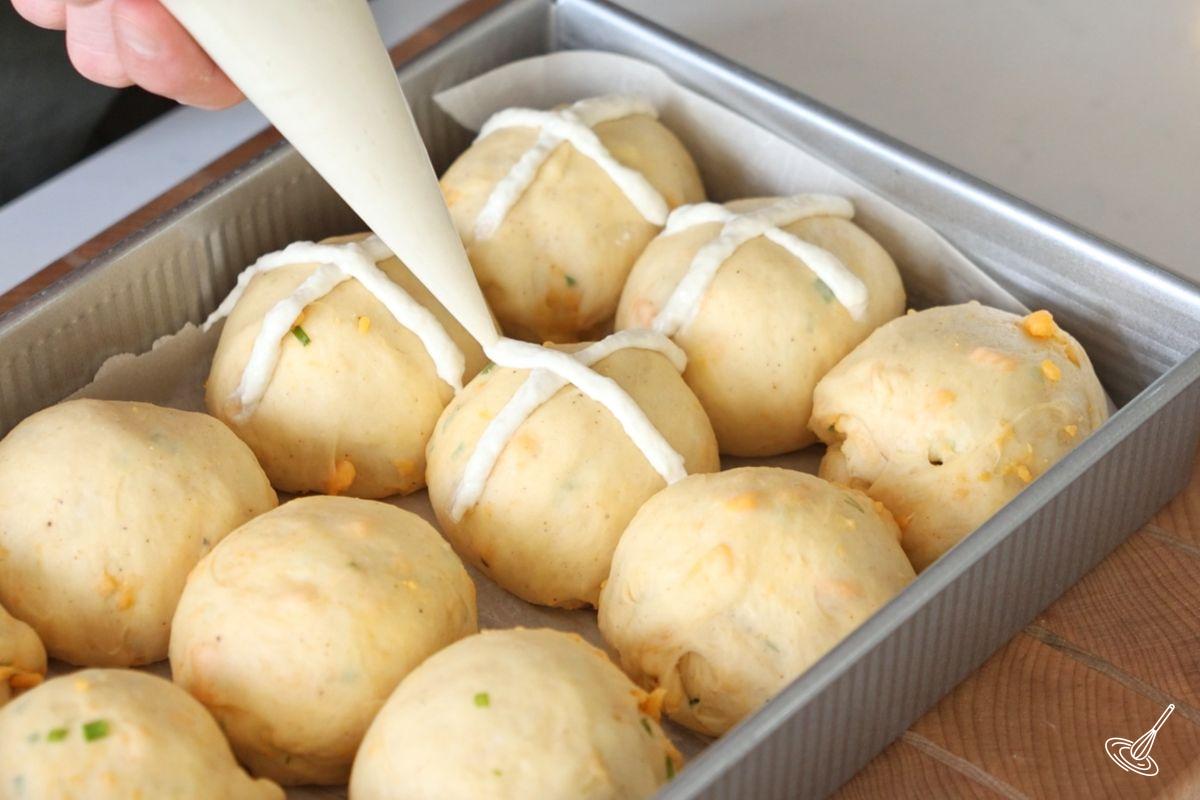 Create a savory version of Hot Cross Buns with sharp cheddar cheese and chives, finished with garlic butter.