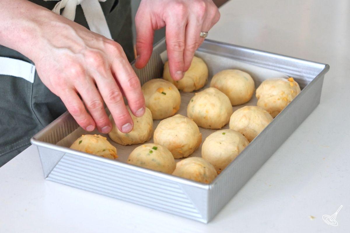 • Divide dough into 12 pieces and roll into balls. Place in a parchment-lined 9×13 pan. Cover and let rise 30–40 minutes.