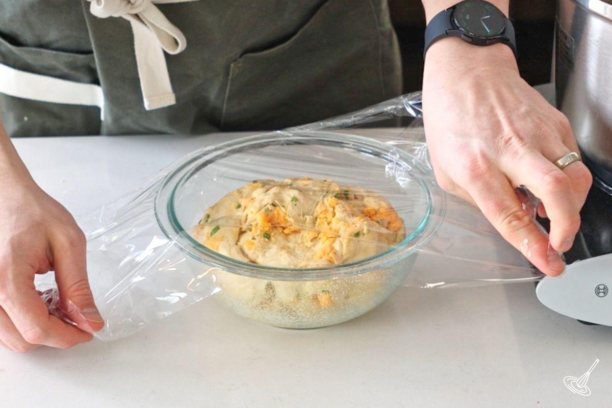 • Pour into the dry ingredients; the melted butter, eggs, and proofed yeast mixture. Knead for 5 minutes of until the dough comes together, until smooth. Fold in shredded cheddar and chives during the final 30 seconds of kneading.