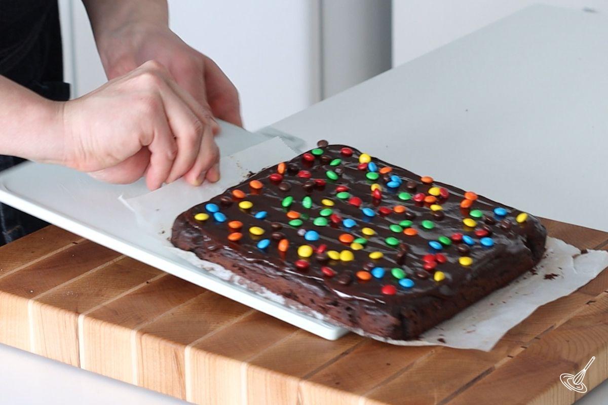 - Slide a cutting board or large plate under the freshly decorated brownies. Refrigerate for 15-20 minutes to allow the glaze to set before cutting.