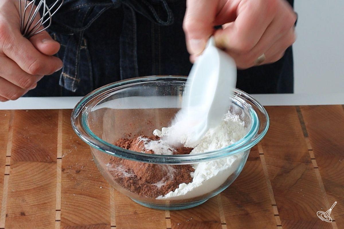 - Combine the Flour, Cocoa Powder, Baking Soda, Salt, and optional Espresso Powder, in bowl and whisk them to combine. Set aside.