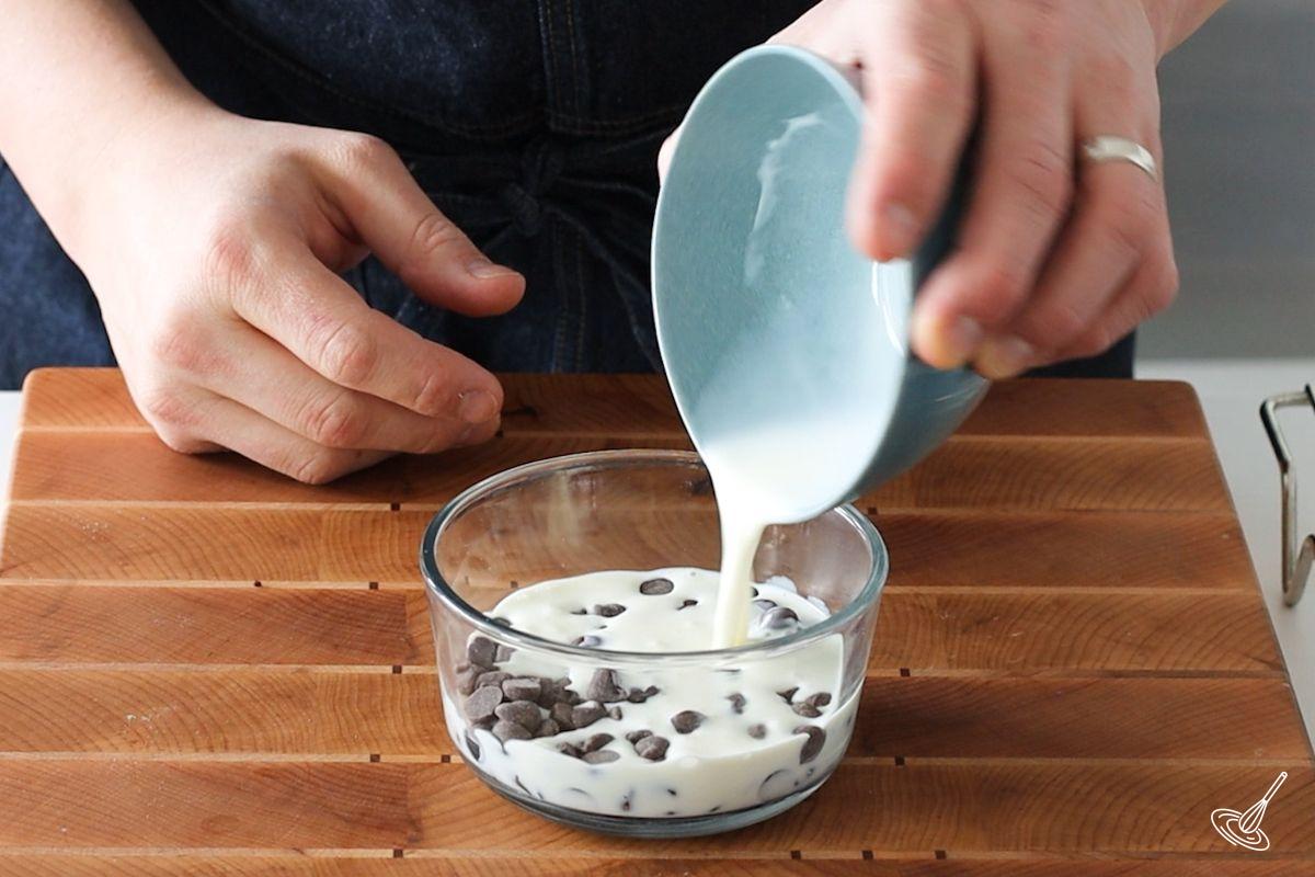 - Warm up the cream until hot, either in a small sauce pan or in the microwave. Pour the hot cream over the chocolate chips in a small bow. Let it rest for 1 minutes and start stirring in the center of the bowl until the ganache starts to form (core) and keep stirring until completely smooth.