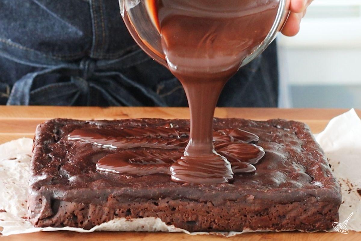 - Remove the brownies from the pan, keeping the paper under it. Pour the chocolate ganache over the cooled brownie. Use a spatula or the back of a spoon to evenly spread the ganache over the brownies.