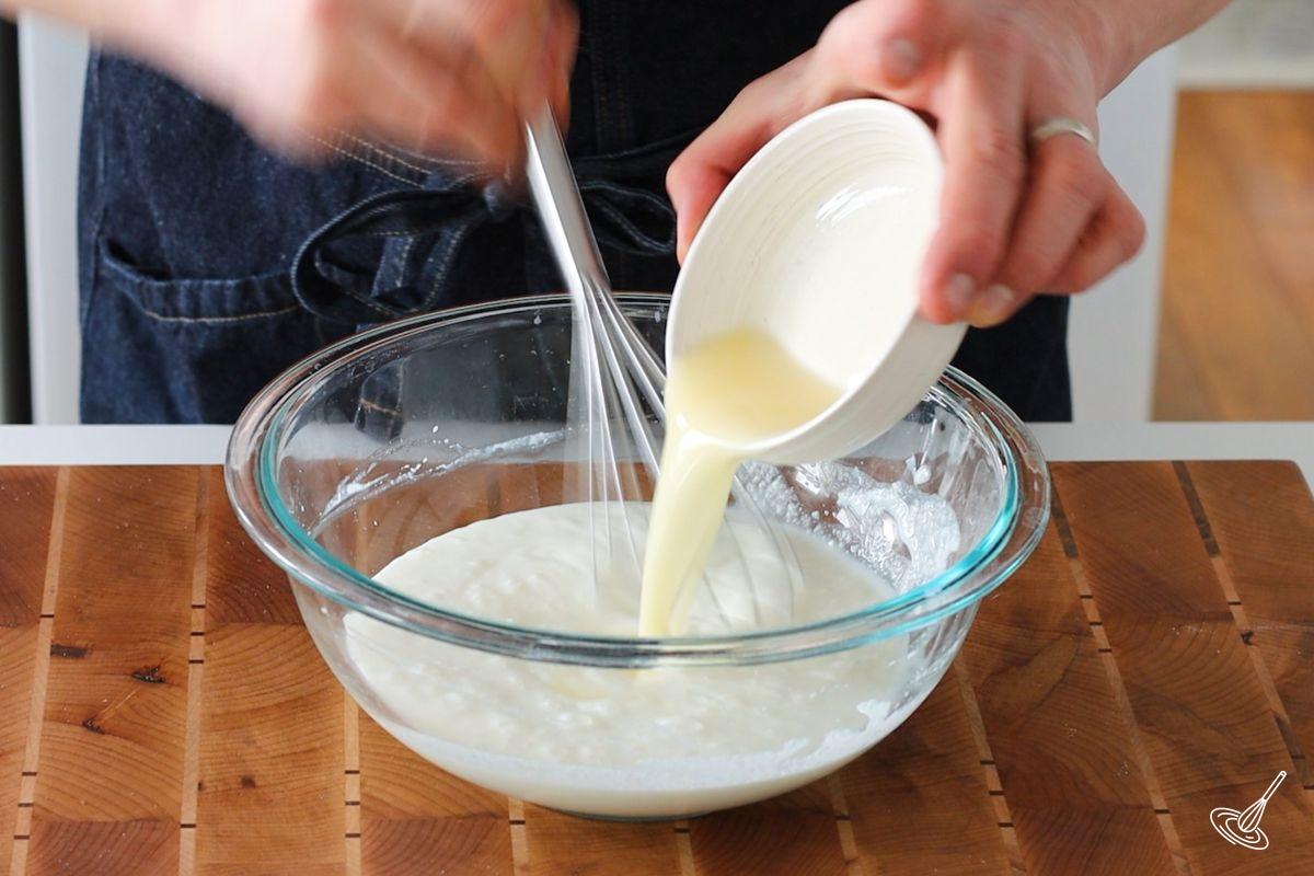 6. Add the dry ingredients to the wet ingredients. Use a whisk to start mixing the batter.