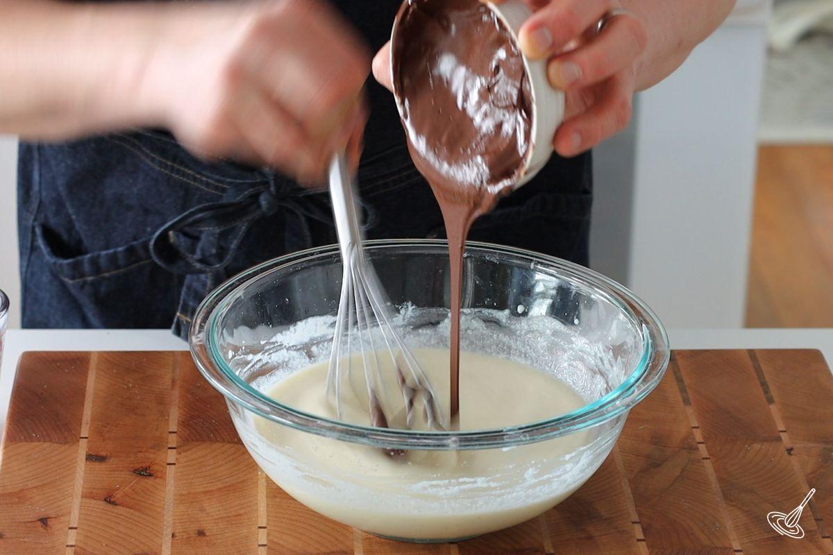 5. Whisk continuously and pour in the melted chocolate. Keep whisking vigorously until the chocolate is well incorporated.
