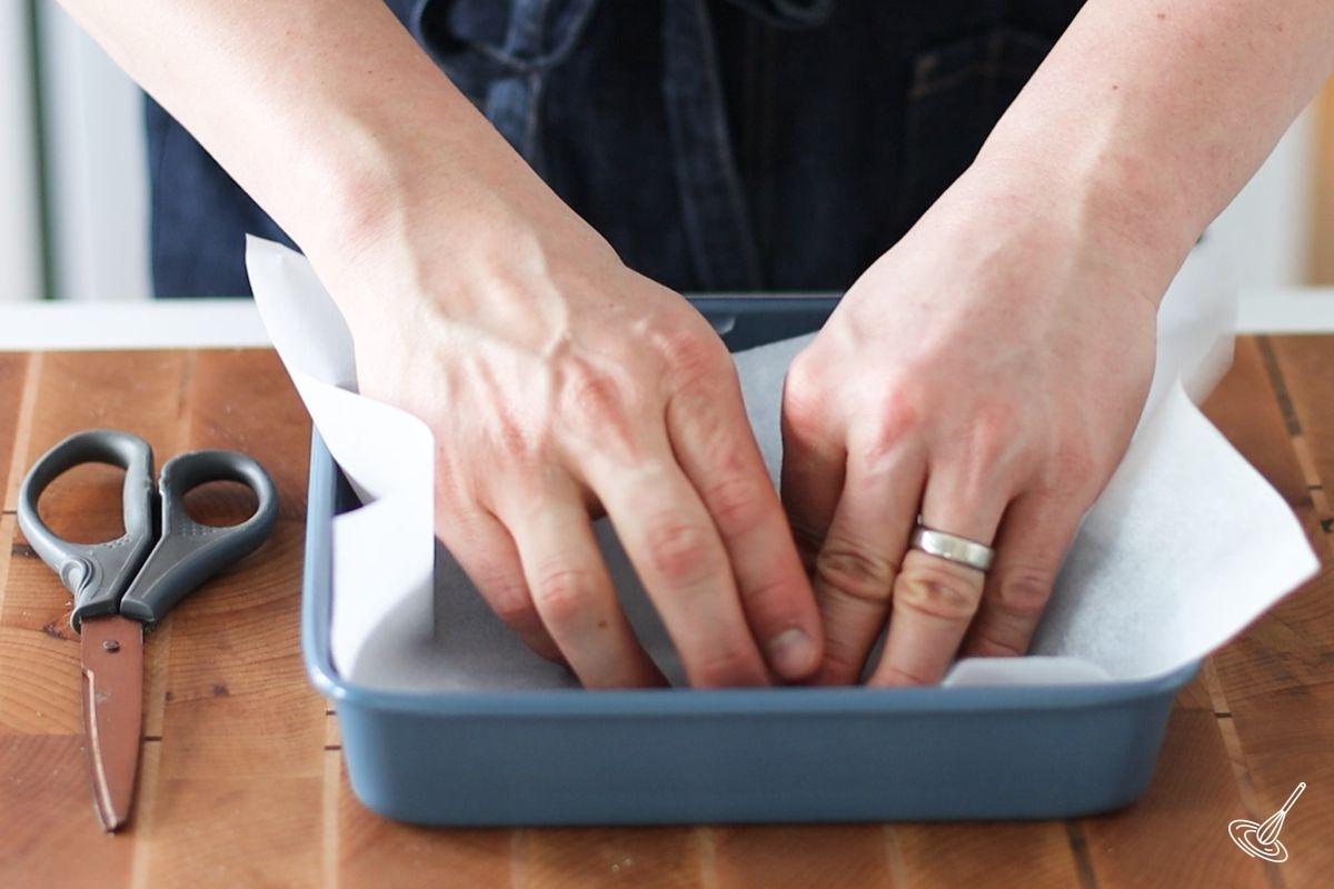 - Grease an 8"x8" baking pan lightly with butter of non-stick spray. Line the baking tray with parchment paper, making sure it runs up the side of the pan as well.