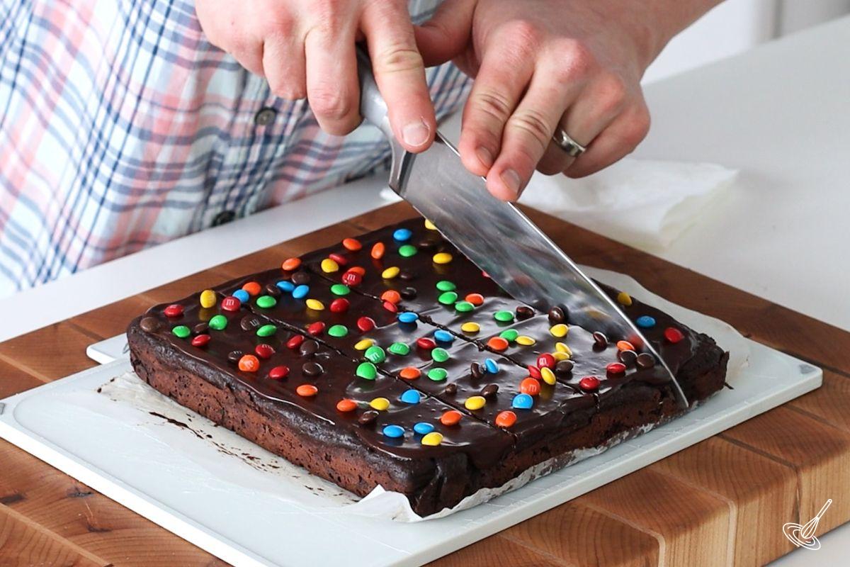 - Use a large chefs knife to cut the brownies into your desired sized pieces. Run the knife under hot water to warm it up. Use paper towel to dry off the hot knife and proceed to make a cut into the brownies. Wipe down the knife and repeat the process with the hot water and paper towel to get clean easy cuts.
