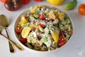 - Pour half of the dressing over the ingredients to start, and toss everything together. Adjust the amount of dressing to your preference. Place the Cucumber Tomato Pasta Salad in your serving bowl and garnish with the feta cheese and chopped chives.¼ cup Crumbled Feta, 2 tablespoon Fresh Chives