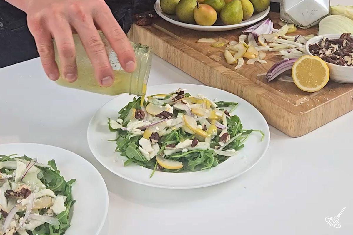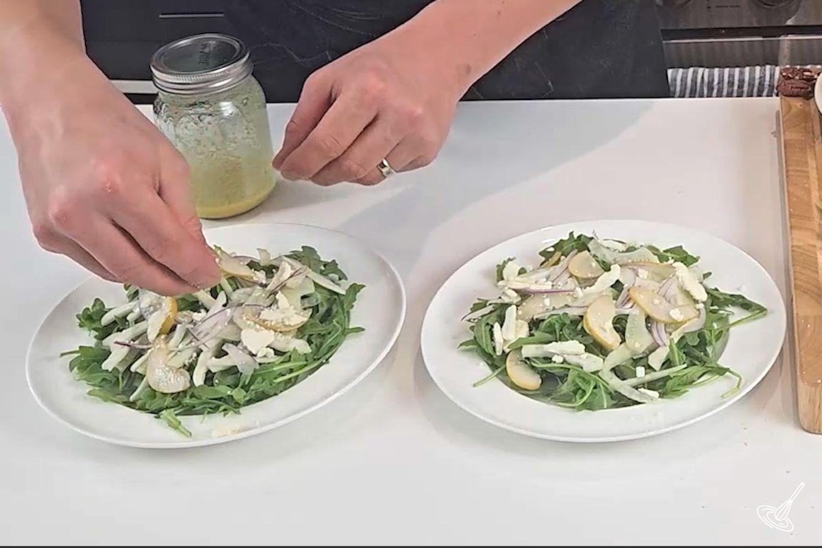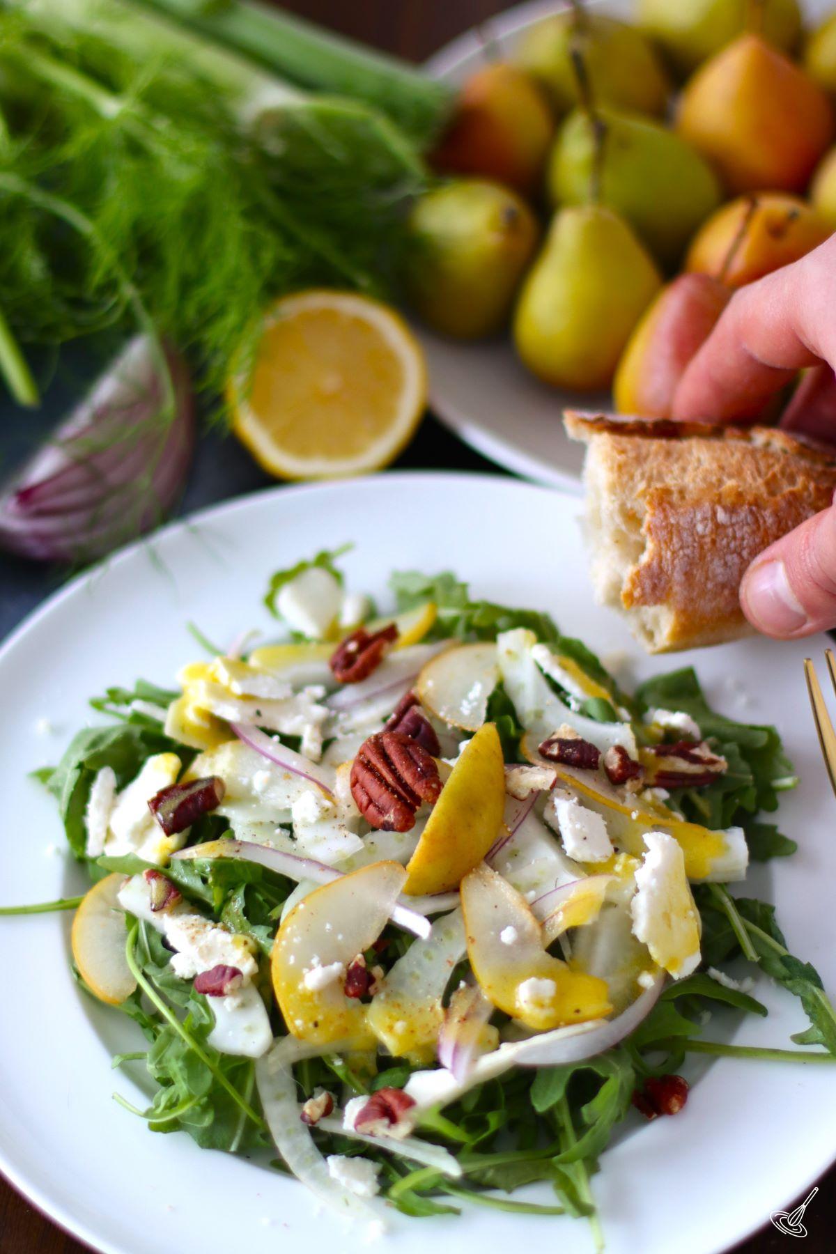 Top the arugula with the fennel, pear, onion, crumbled feta, and toasted pecans.