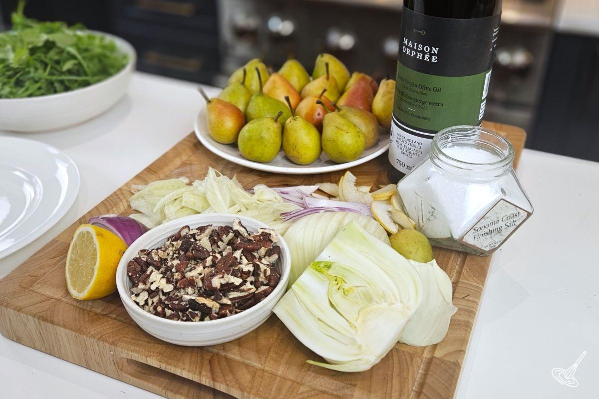 Start by gathering all the ingredients for the salad. This include, washing your fennel bulb, and toasting your pecans if needed.
