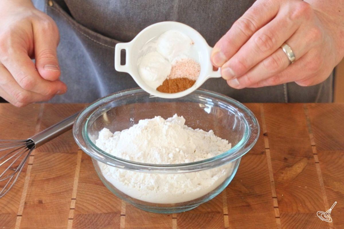 2. Dans un grand bol, fouettez la farine, la levure chimique, le bicarbonate de soude, le sel et la cannelle.