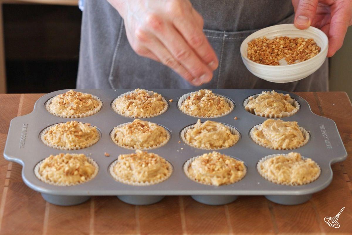 - Ajoutez les ingrédients liquides aux ingrédients secs et mélangez délicatement jusqu'à ce que le tout soit homogène. Évitez de trop mélanger. Incorporez ensuite les ingrédients facultatifs.⅓ tasse Cacahuètes hachées