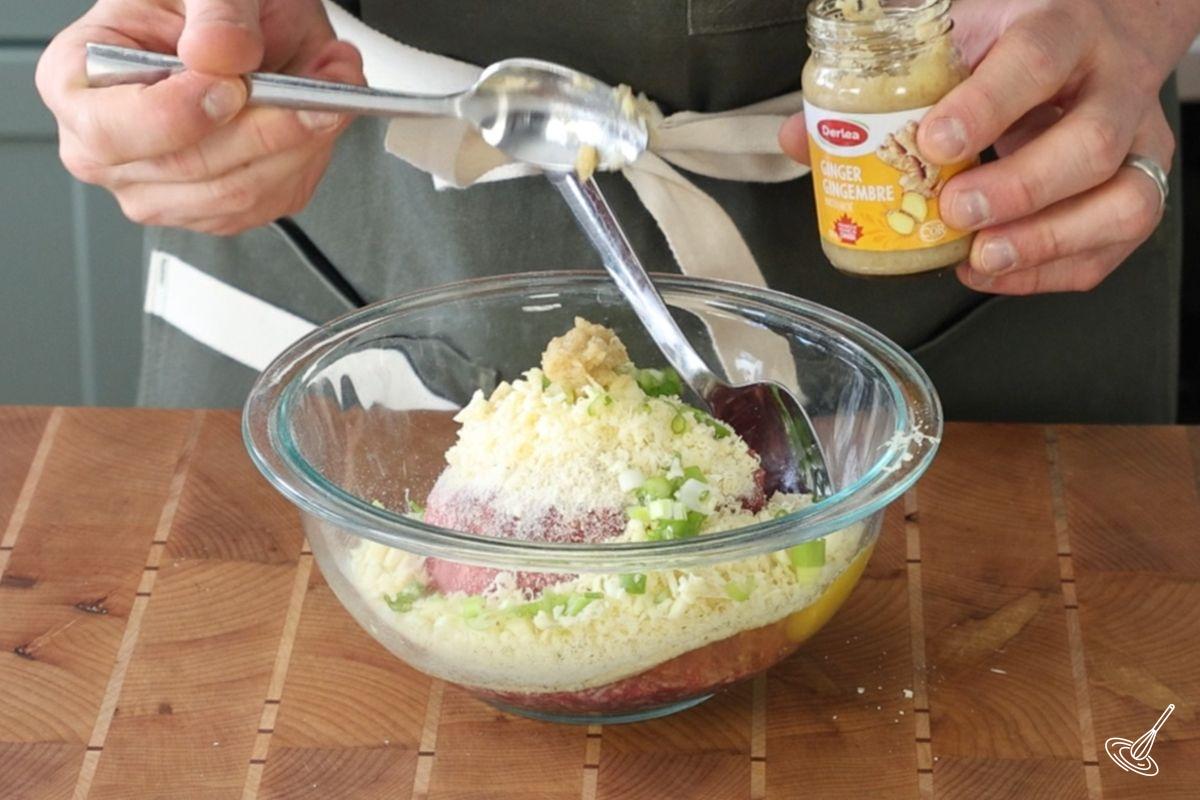 - Dans un saladier, mélanger le bœuf haché, l'œuf, la chapelure, le parmesan, l'oignon vert, le gingembre, l'ail et la sauce soja. Mélanger à la main jusqu'à obtenir une préparation homogène.