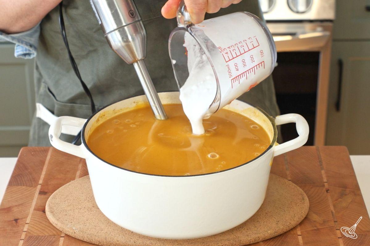- Retirez la soupe du feu. Utilisez un mixeur plongeant pour réduire la soupe en purée lisse. Incorporez ensuite le lait de coco à la soupe.