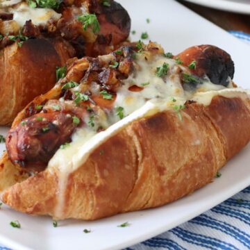 Trade in your boring buns for flaky butter croissants, and then make my French Onion Hot Dog recipe! Although we are HUGE fans of our Pretzel Hot Dog Buns, using croissants for this hot dog makes it NEXT LEVEL! Garnish with Dijon mustard, Brie cheese and caramelized onions, before placing it under the broiler to melt the cheese perfectly. Learn how to make caramelized below, or purchase premade caramelized onion in a jar to make your life a lot easier!