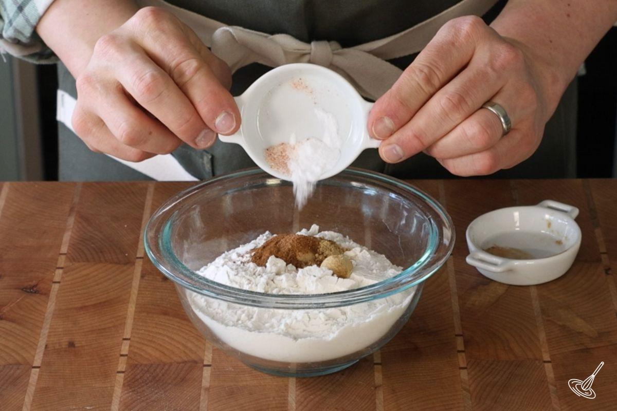 - Combine in a bowl, the flour, ginger, cinnamon, nutmeg, baking soda, and salt. Use a whisk to mix well and set aside.1⅓ cup All Purpose Flour, 1½ teaspoon Ground Ginger, 1 teaspoon Ground Cinnamon, ¼ teaspoon Ground Nutmeg, ½ teaspoon Baking Soda, ¼ teaspoon Salt