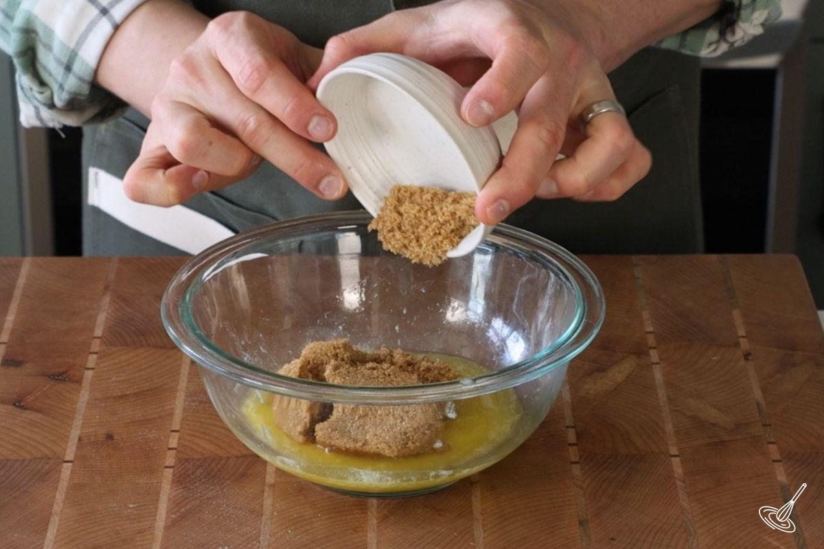 - Add to a large mixing bowl, the melted butter and brown sugar. Use a hand blender to cream until light in colour.½ cup Unsalted Butter, ¾ cup Brown Sugar