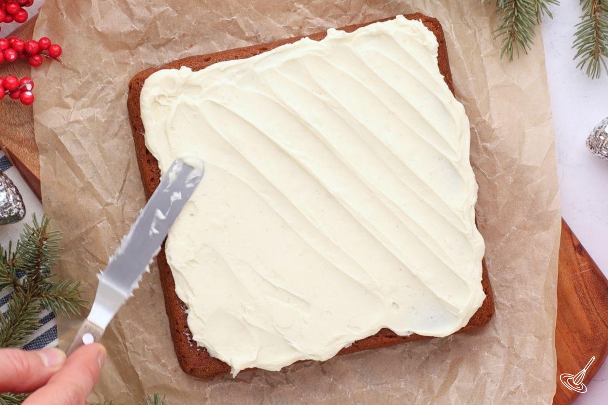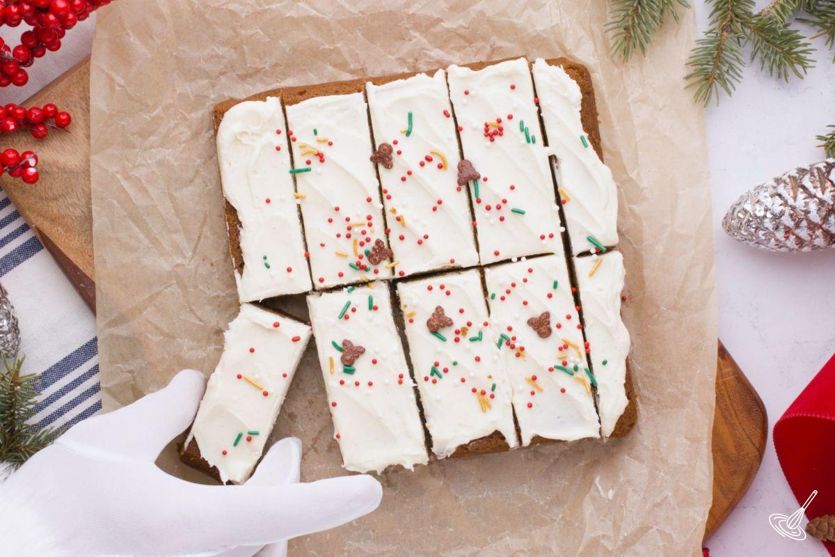 - Remove the cooled Gingerbread Cookie Bars from the pan. Spread the icing evenly over the top of the bars with a spatula. Decorate the bars with holiday themes sprinkles if desired. Cut into 10 bars of even smaller squares.
