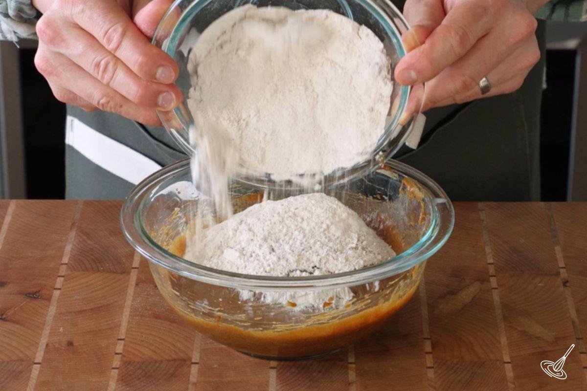- Add the flour mixture to the large bowl and carefully mix the ingredients together until just combined and no dry flour remains.